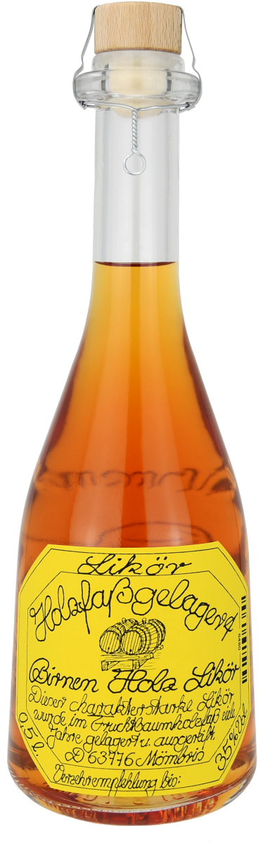 Aus diesen Tafelbirnen habe ich vor circa zehn Jahren einen Likör hergestellt. Aus einem Birnbaum habe ich in der Küferei Wilhelm Eder GmbH in der Pfalz ein Birnbaum Holzfass herstellen lassen und habe dann zehn Jahre lang diesen Birnenlikör in diesem Birnbaum Holzfass gelagert. Herausgekommen ist ein Bernsteinfarbener ganz toll nach Birnen duftender Likör.