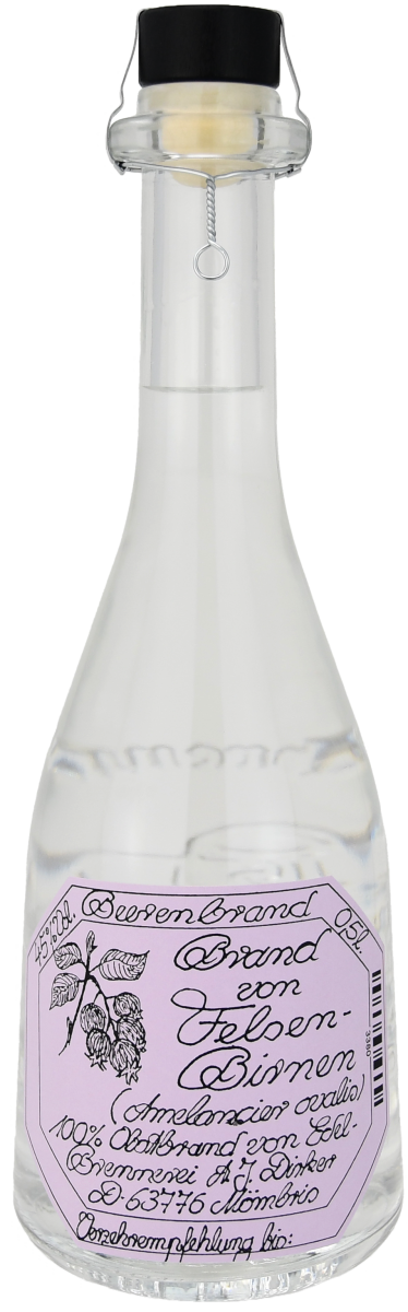 Die gemeine Felsenbirne wird auch Felsenmispel oder Edelweißstrauch genannt. Das vorkommen der Felsenbirne erstreckt sich über ganz Europa bis nach Vorderasien und auf eine Höhenlage bis zu 1945 m. Die Felsenbirne bezaubert uns im Frühling mit ihren sternförmigen einem Edelweiß ähnlichen weißen Blütenmeer, welches Schmetterlinge anzieht und als Bienennahrung dient. Seit dem 16. Jahrhundert wird die Felsenbirne auch in den Gärten kultiviert. Die leicht mehligen Früchte schmecken süß und man kann daraus eine leckere Marmelade herstellen. Tatsächlich ist die Felsenbirne ein Rosengewächs und somit mit den Äpfeln verwandt. Wir fanden den süßen Geschmack in Verbindung mit der herben Note aus den Schalen als sehr anspruchsvoll und geeignet für einen Brand daraus herzustellen.