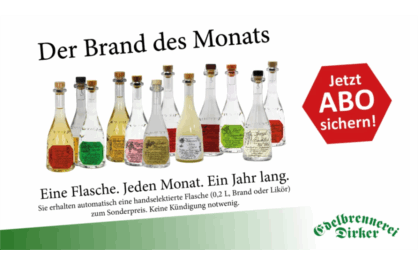 Sie erhalten 1 Jahr lang monatlich den Brand des Monats zum Monats-Sonderpreis inkl. Verpackung und Versand. Der Brand des Monats besteht aus jeweils einer Flasche 0,2 Liter Destillat oder Likör. Dieses Abo muss nicht gekündigt werden. Es endet automatisch nach 12 Monaten und kann danach ggf. neu bestellt werden! keine zusätzlichen Versandkosten!